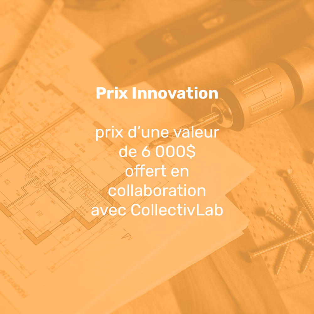 Mettant en lumière un projet particulièrement prometteur sur le plan entrepreneurial, le prix Innovation donnera accès aux expertises, bureaux et équipements du CollectivLab pour une valeur de 6000$. Les lauréat.e.s pourront ainsi propulser les prochaines étapes du développement de leur projet.